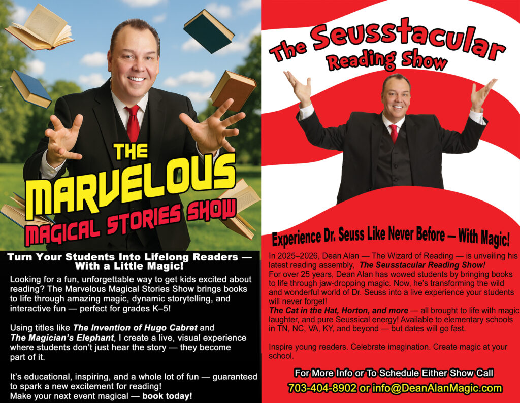 One Virginia Beach school asked me to create a custom reading assembly based on EllRay Jakes Is Magic. I produced morning video segments leading up to the event and performed two themed assemblies on show day. Because students already knew the book, they were more engaged—and the magic effects helped reinforce key story elements in a way that made the book come alive.